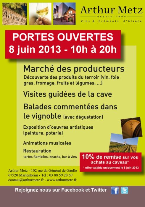 Agenda - Produits - Tourisme & Loisirs Marlenheim, les portes ouvertes Arthur Metz Pour célébrer les 5 ans de son nouveau caveau, Arthur Metz organise sa journée portes ouvertes . Cela se passe… LIRE LA SUITE