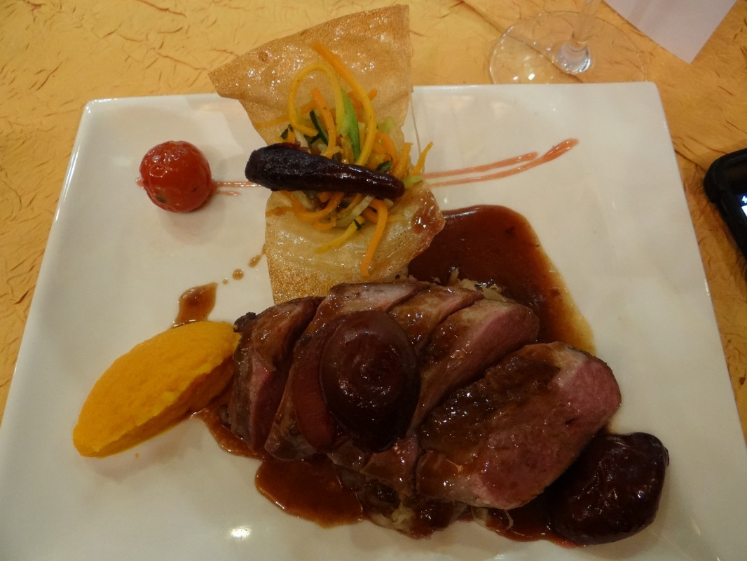 Magret poêlé rosé, choucroute nouvelle sautée et caramélisée, Quetsches au vin rouge à l’aigre-douce