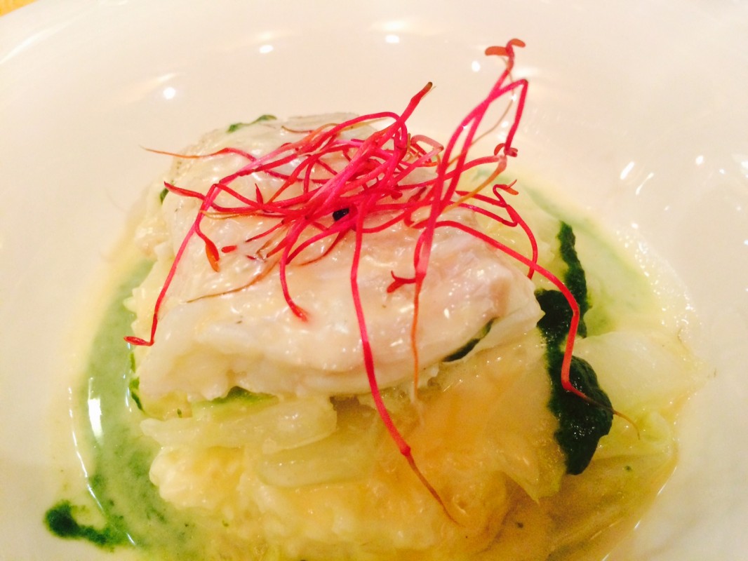 Dos de cabillaud poché, lit de chou chinois, risotto crémeux