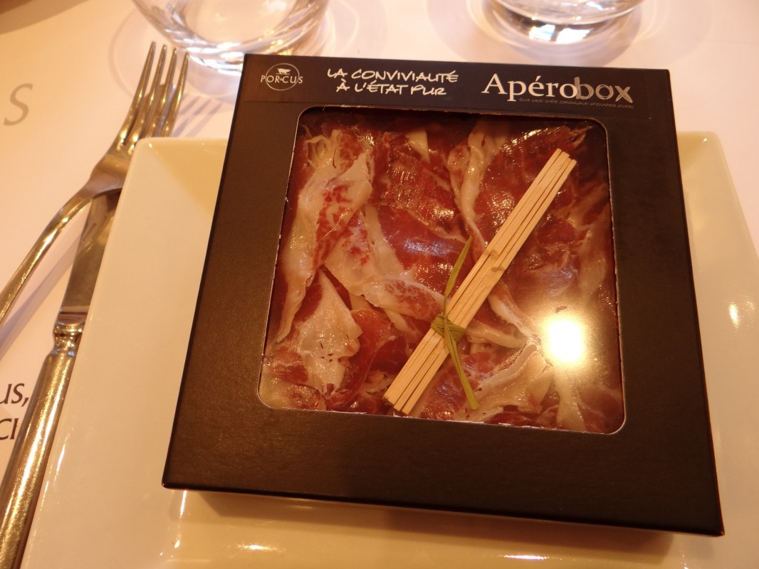 DSC016613ème surprise enfin, les Apérobox… Des écrins noirs sobres et classes. Le traditionnel assortiment de charcuterie devient la promesse d’un moment gourmand convivial et réussi.  Lard de côte, Jambon Pata Négra, Saucissons et charcuterie proposent le meilleur de la charcuterie.