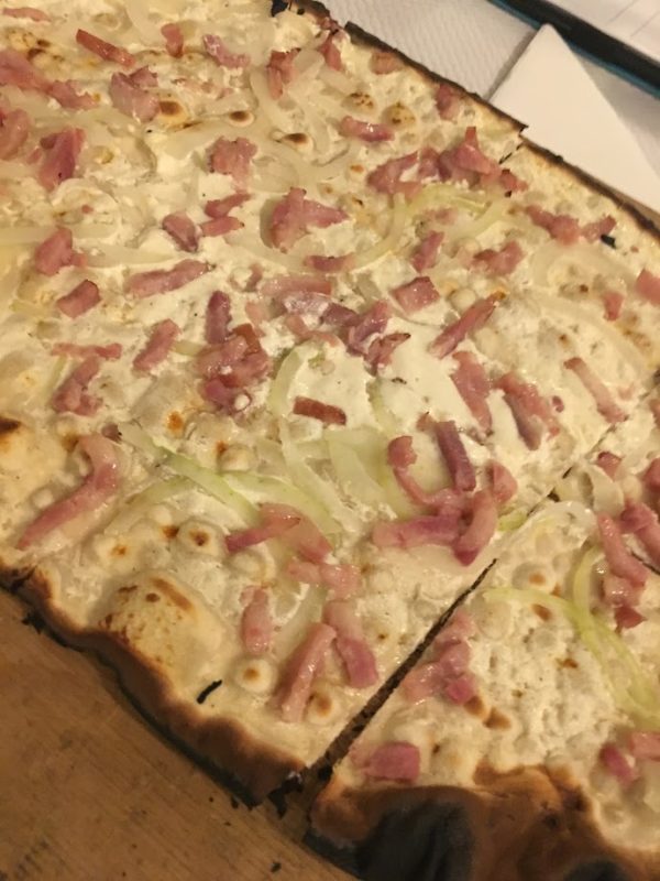 La révélation : La tarte arrive, fumante, dorée, légèrement bombée, traditionnelle d’abord. On ne touche pas tout de suite. On regarde. Les oignons translucides, les lardons croustillants, la crème qui bulle doucement. Premier coup de couteau : un craquement. Les locaux la roulent et la mange sans couvert. Première bouchée : une explosion. Le gras, le sel, les lardons, la crème, les crèmes parfois. Le cerveau s’éteint. Le corps s’allume.