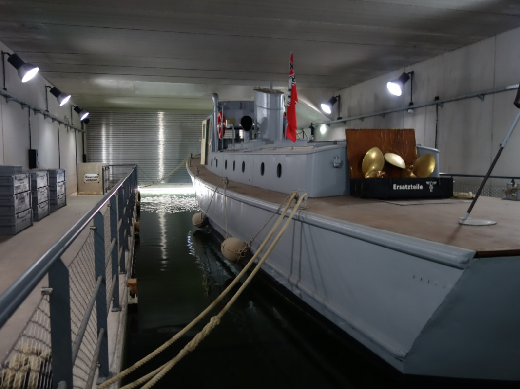 Un kiosque de sous-marin interpelle, mais bien moins que cette reconstitution d’une base de la Kriegsmarine et sa vedette de 20 mètres flottant dans son bassin !