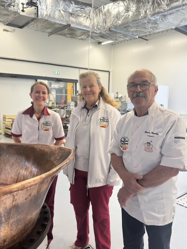 La visite ne s’arrête pas au musée. Sur 200 m², l’atelier de fabrication ouvre ses portes en permanence : les chaudrons en cuivre centenaires sont en activité, jusqu’à 16 heures (sauf le dimanche) mijotant fruits et sucre sans le moindre additif ni gélifiant.