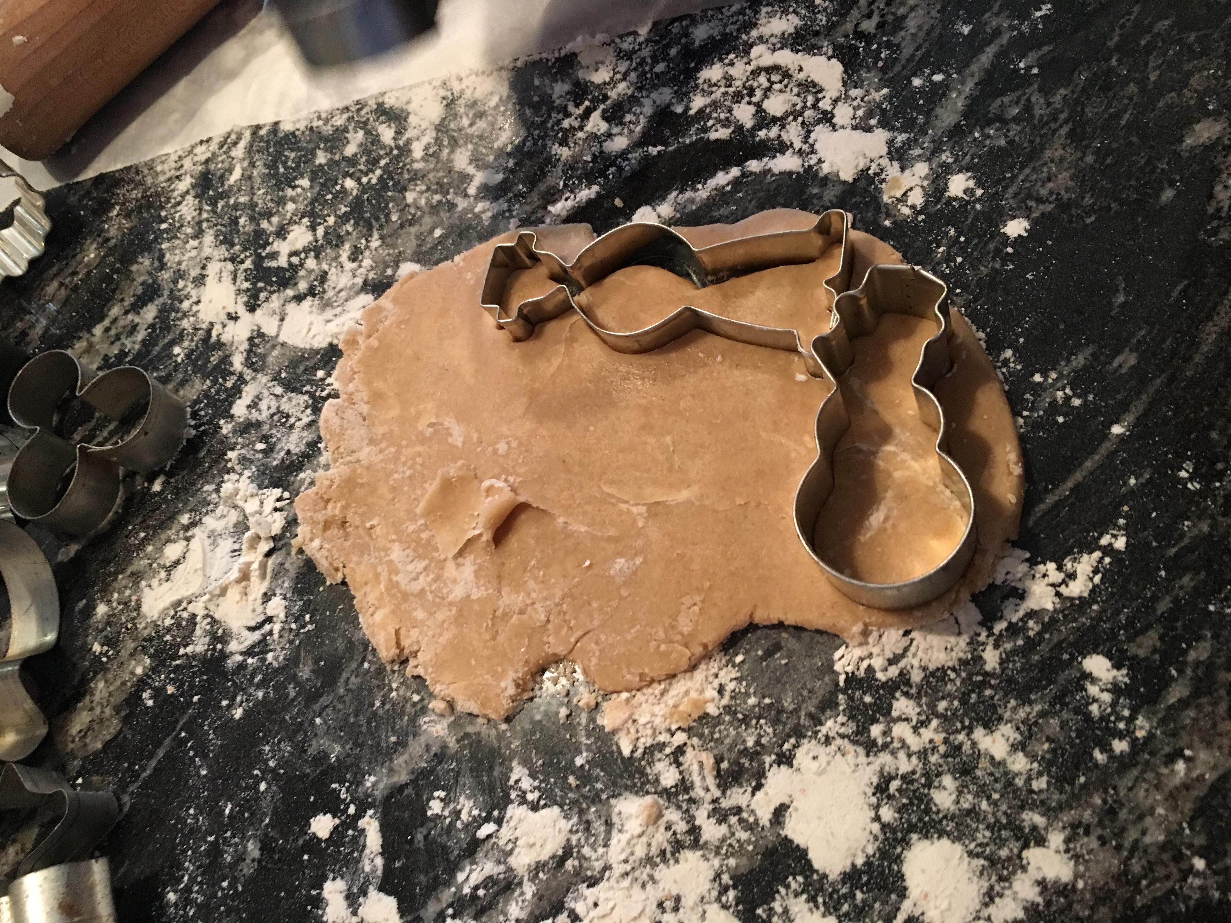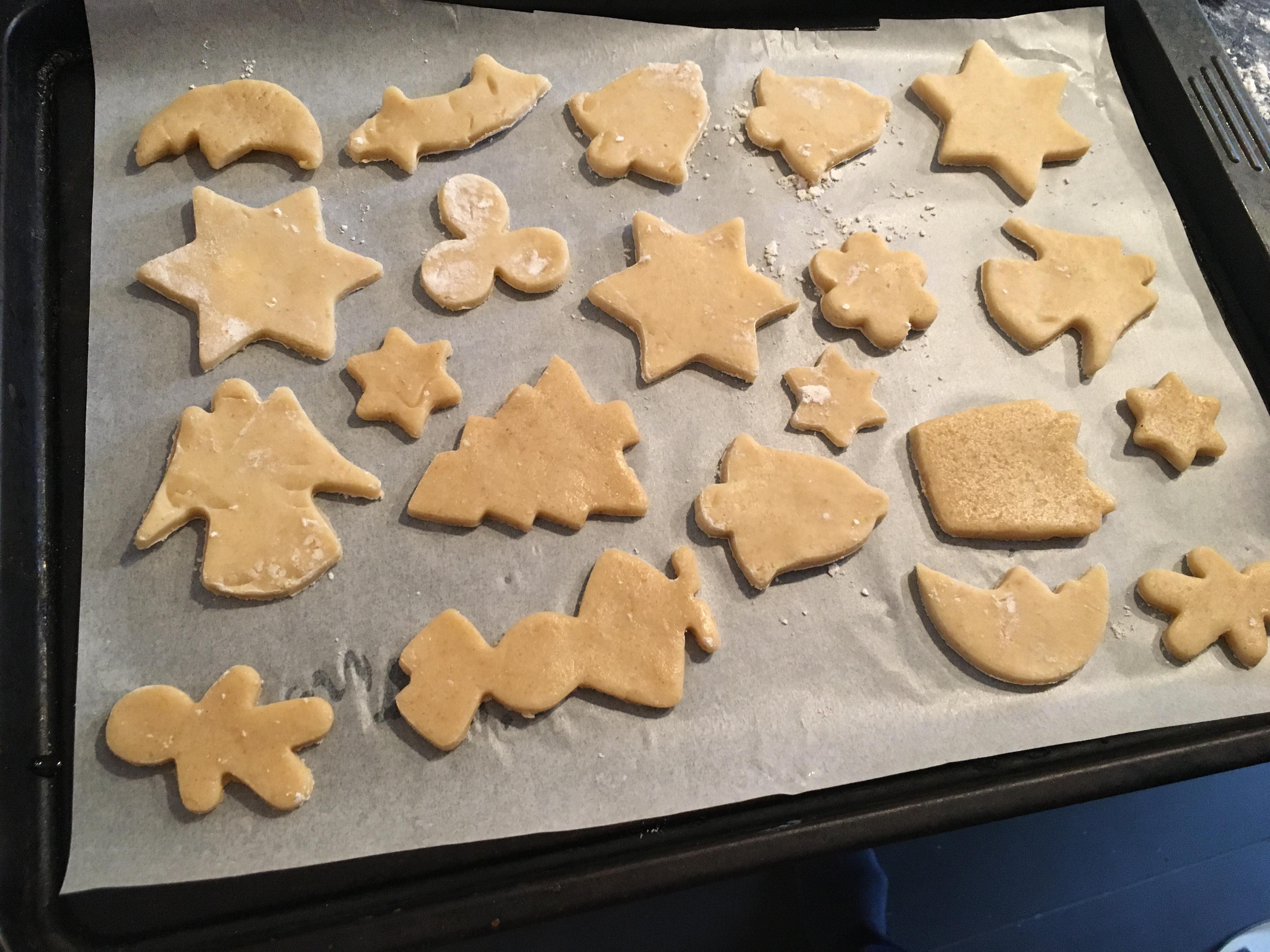 Puis, étalez la pâte au rouleau à pâtisserie pour qu’elle ai 3 mm d’épaisseur. Et découper avec les formes à gâteaux (sapin, étoile, bonhomme….)