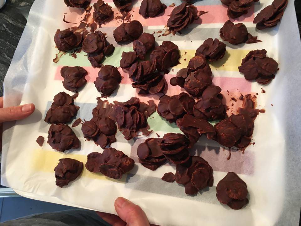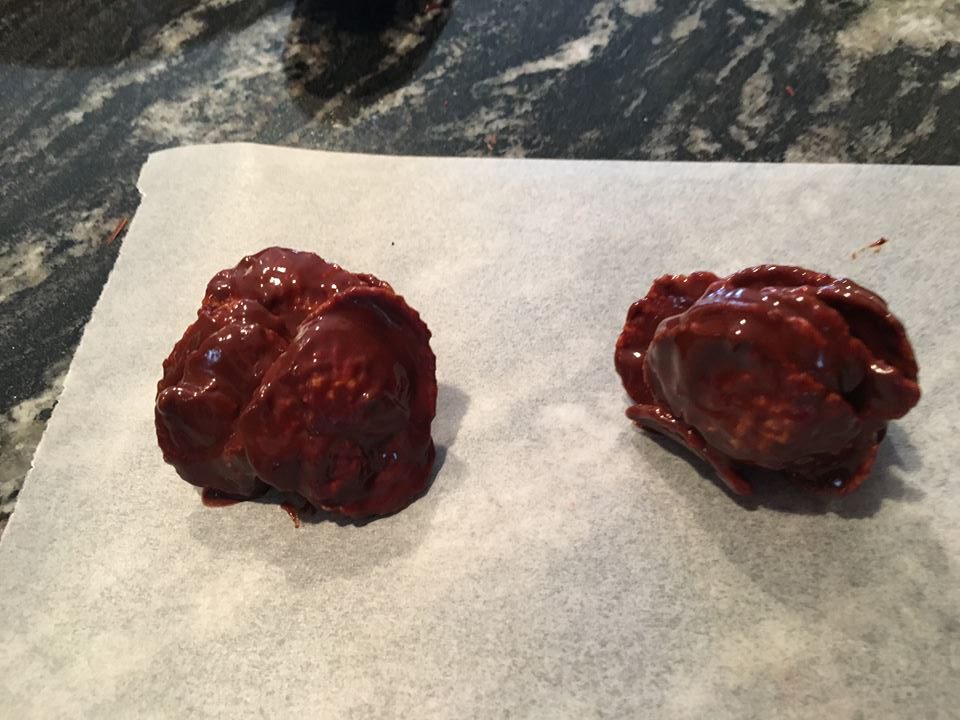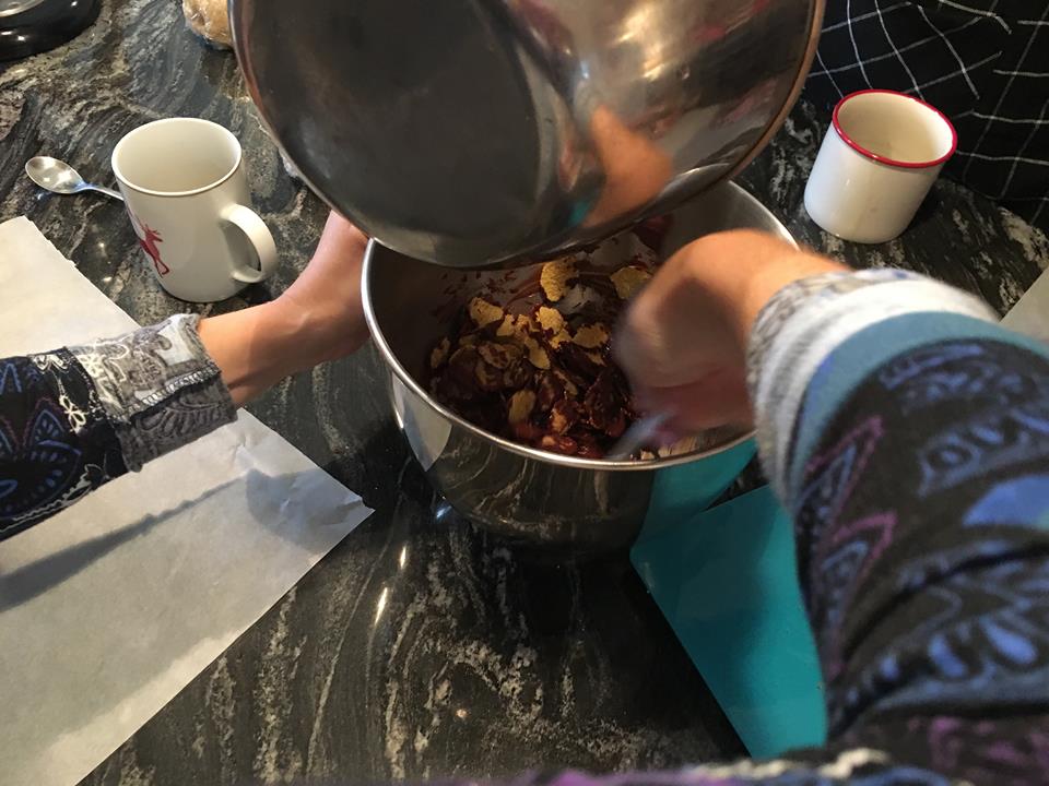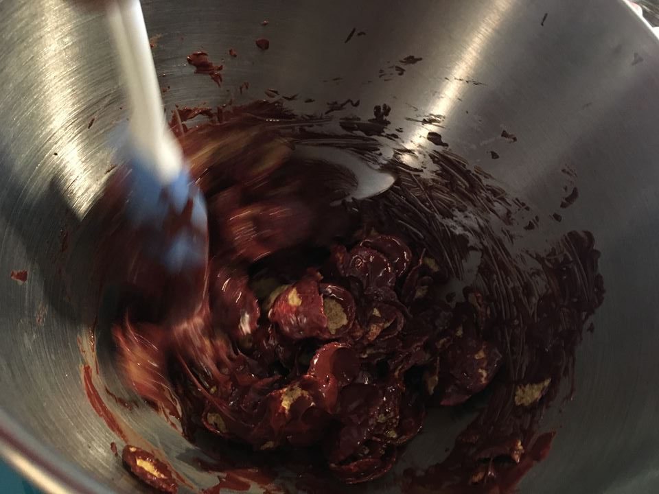 Mélanger ensuite le chocolat fondu et les cornflakes. Jusqu’à ce qu’ils sont complètement recouverts de chocolat,