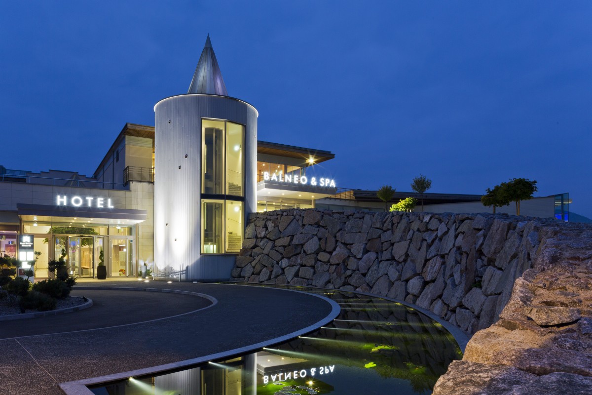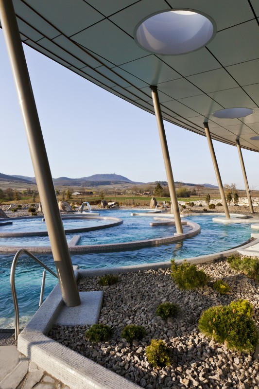 Cet espace est unique ; il comprend 550 m3 d’eau à 34 °C avec une vue panoramique sur le vignoble alsacien et la ligne bleue des Vosges.