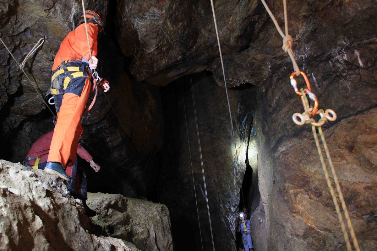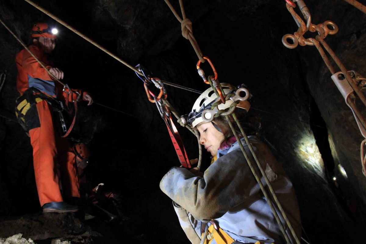 La visite “Grande Colonne” permet une approche complète et ludique de la spéléologie minière avec une montée à l’échelle rigide de 20m environ, le passage d’une vire sécurisée par une ligne de vie, un retour en tyrolienne et une descente sur corde d’environ 20m