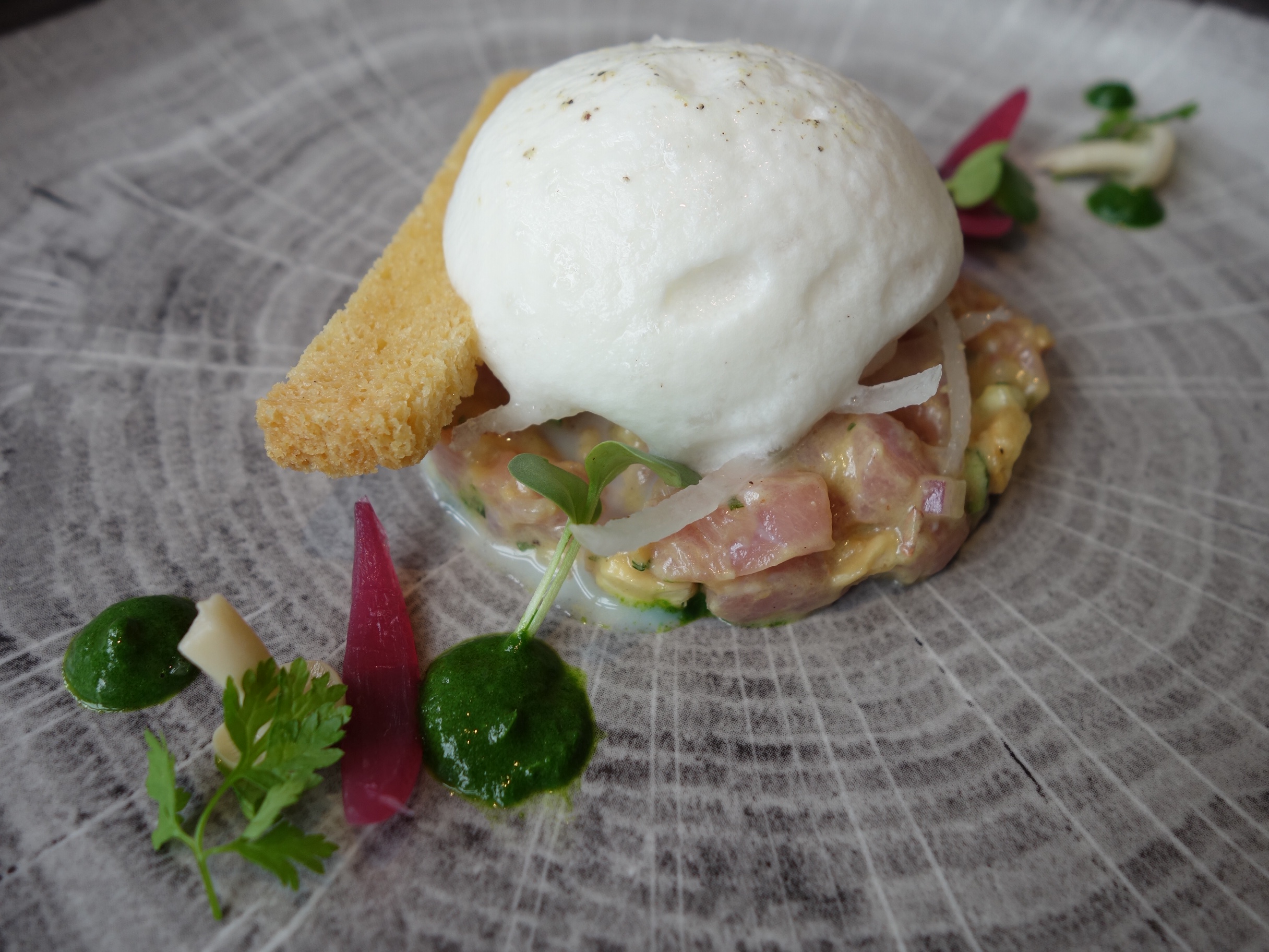 Tout commence par un Tartare de Veau aux Noix de Cajou, Jaune d’Œuf crémeux à l’Huile d’Olive, Radis Daïkon, Purée d’Épinards, Shimeji au Vinaigre et Croûtons au Beurre. Douce découverte de belles saveurs.