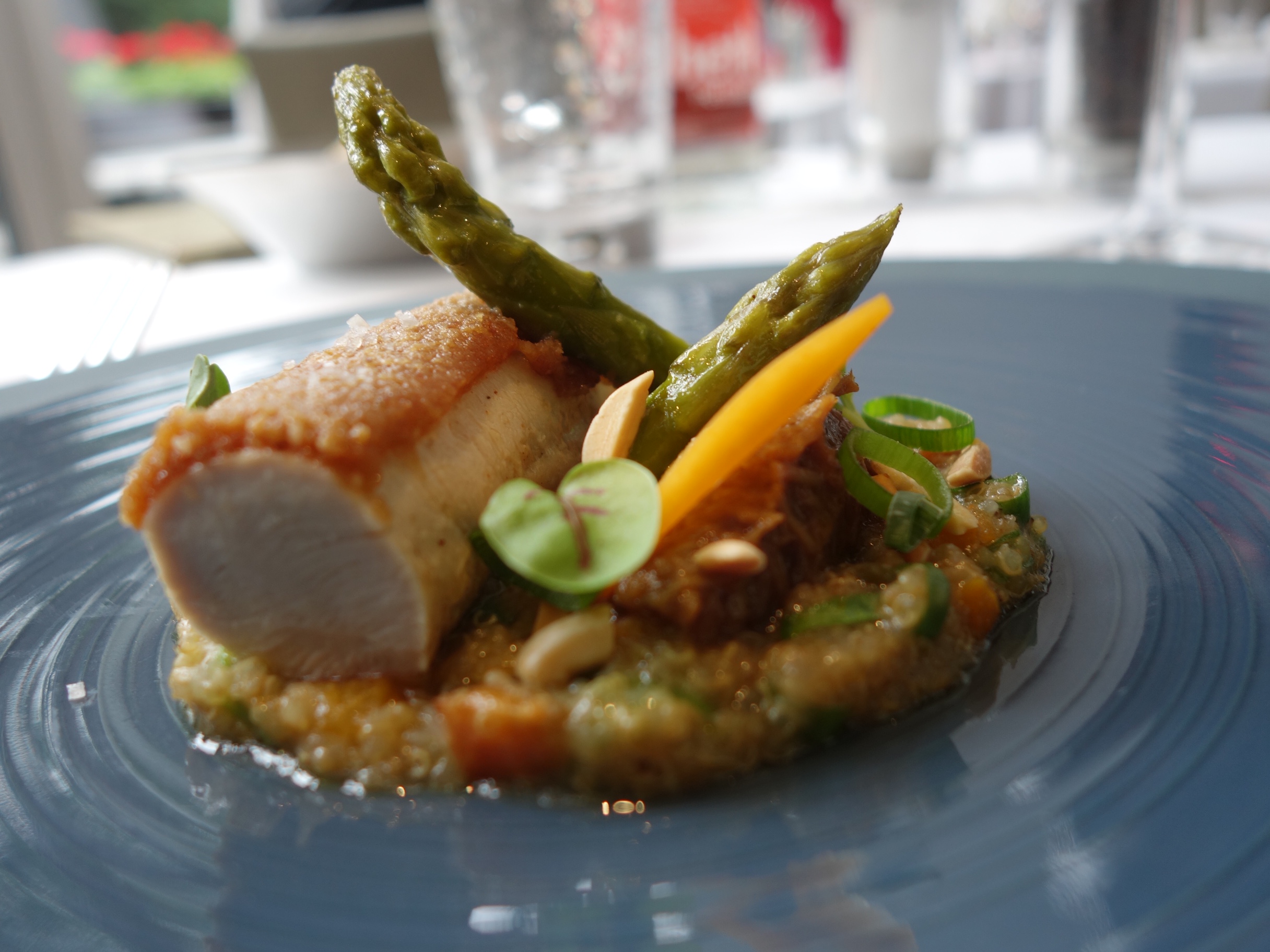 Vient ensuite le Poulet 100 jours « label rouge » en deux préparations, Viennoise Chorizo, Quinoa au Citron confit, Abricots, Asperges vertes et Jus vinaigré… Accompagnée encre par un vin d’Alsace, un Pinot Noir, juste pour le plaisir.