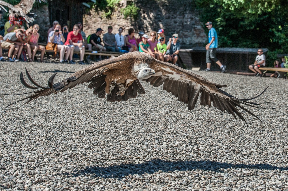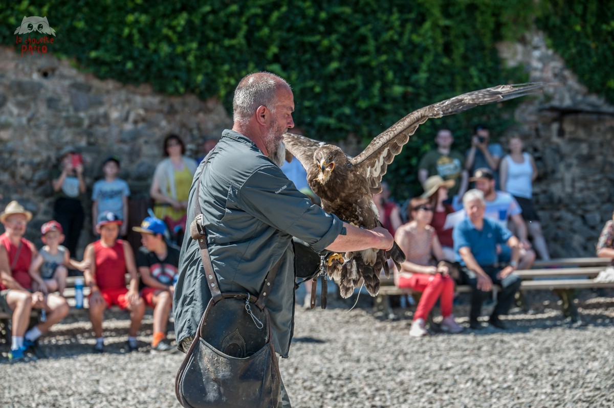 80 rapaces visibles au château, 250 en tout, 75 naissances, 1 tonne de viande consommée. Les animaux sont ici bien traités. On prend soin d’eux et on les nourrit comme il faut. Entrainés chaque jour, ils vous attendent déjà.